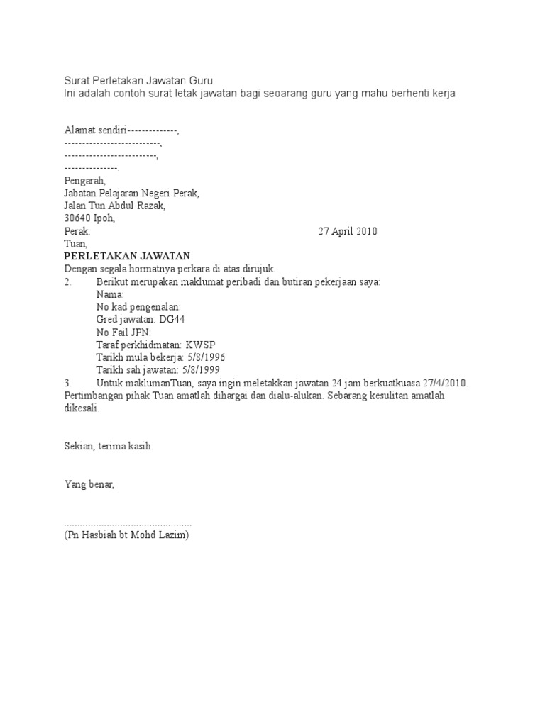 Contoh Surat Perletakan Jawatan Guru Pdf